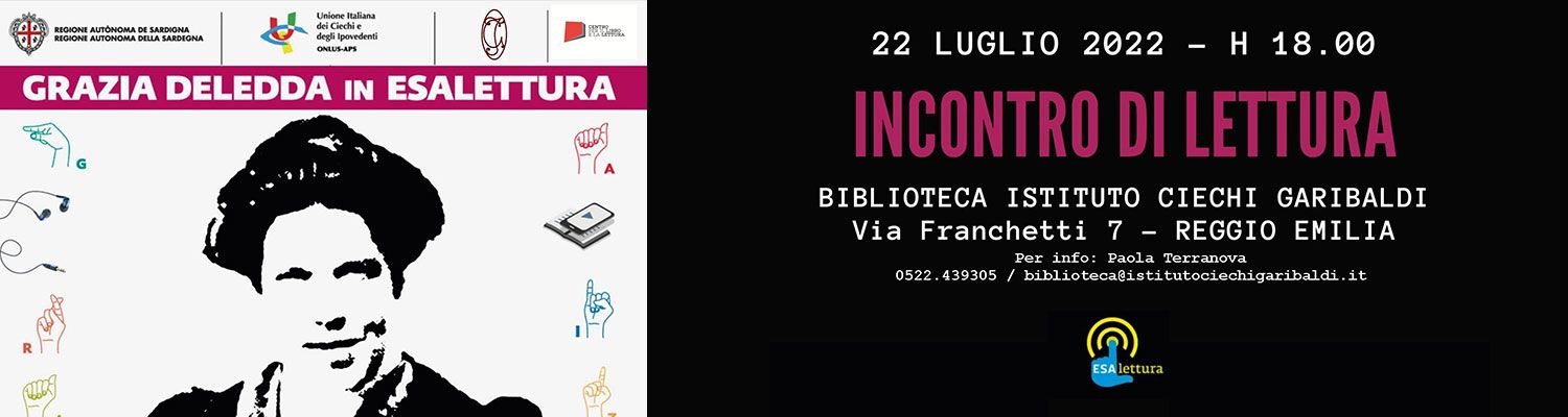 Comunichiamo con piacere ai nostri lettori che venerdì 22 luglio alle ore 18:00 presso la Biblioteca "G. Turchetti ", dell'Istituto Garibaldi per i Ciechi (Via Franchetti 7 – Reggio Emilia), si terrà l'incontro di lettura "Grazia Deledda in Esalettura", progetto portato avanti da alcuni anni dall'U.I.C.I. di Nuoro, per promuovere le differenti modalità di lettura e contemporaneamente per ricordare l'opera di Grazia Deledda.