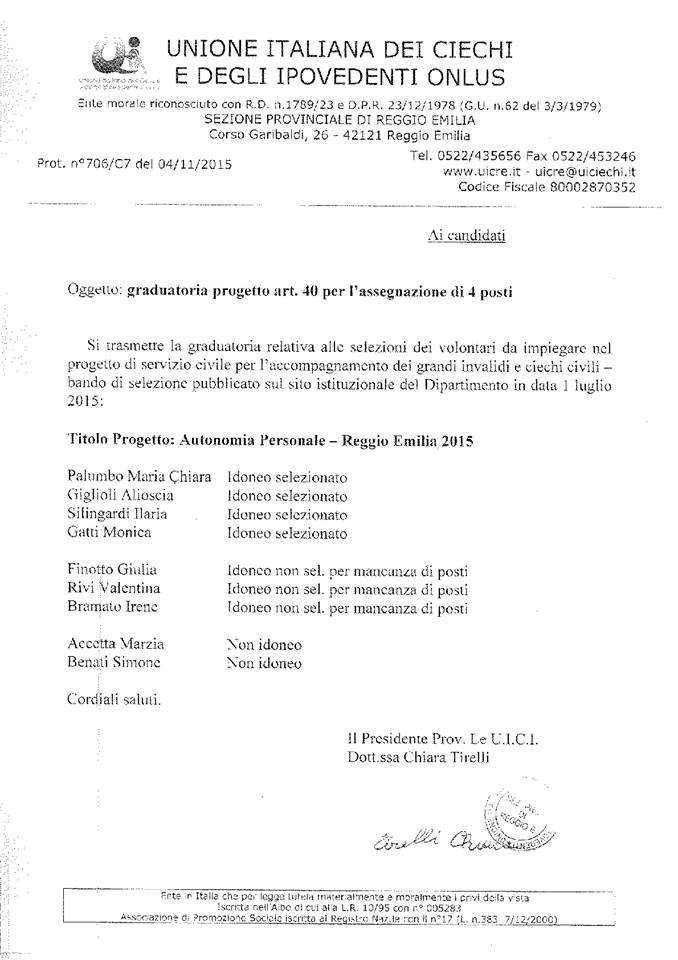 Graduatoria progetto di Autonomia Personale art. 40 della legge n. 289/2002 10-11-2015